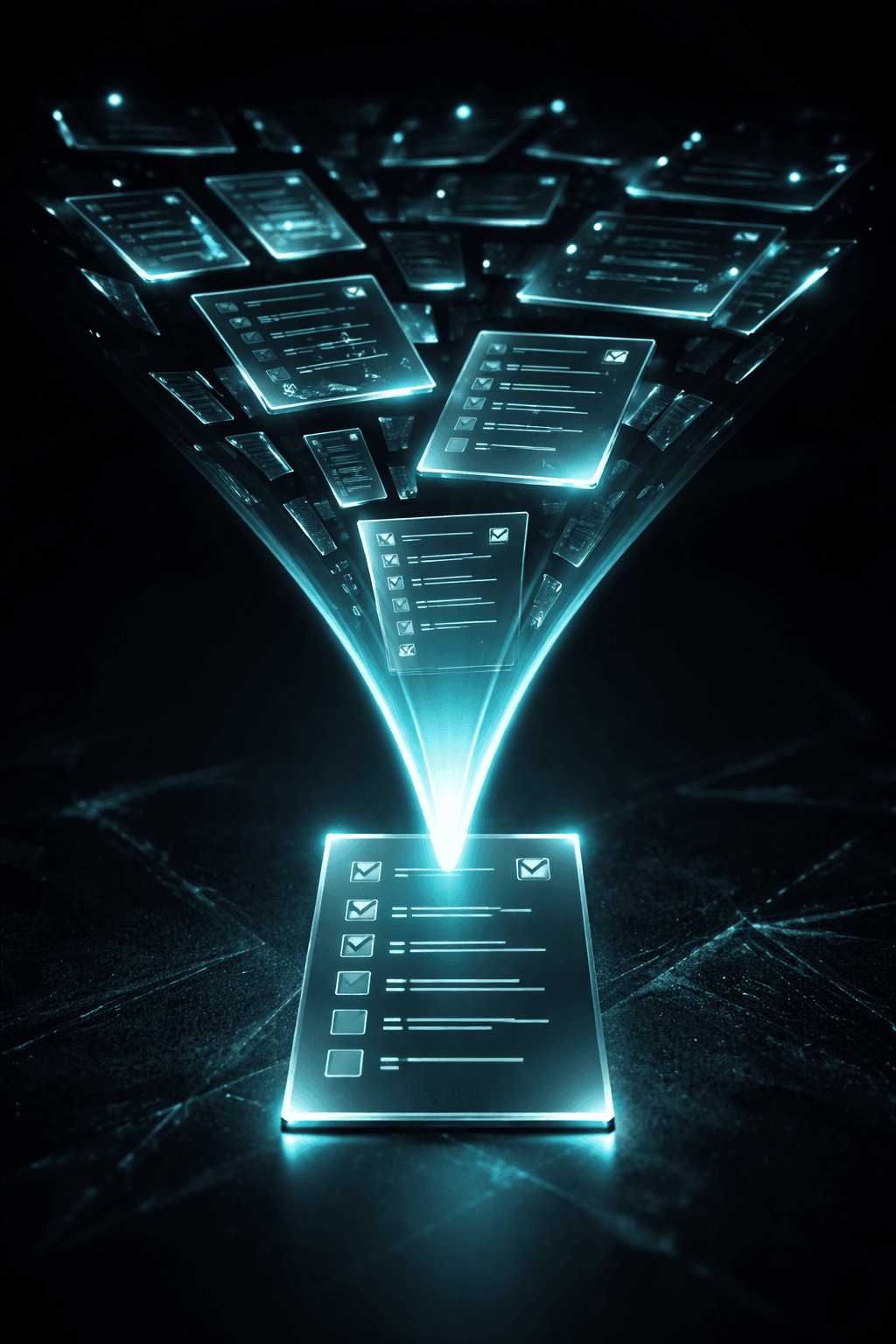 Minimalist triage checklist on glass panels with teal light, alert icons flowing into a single escalation pathway